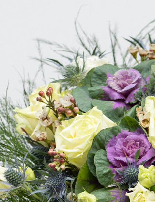 La delicatezza delle rose, l’eleganza dei garofani e dei crisantemi si intrecciano con l’intrigante texture dell’eryngium regalando un profumo fresco e avvolgente.